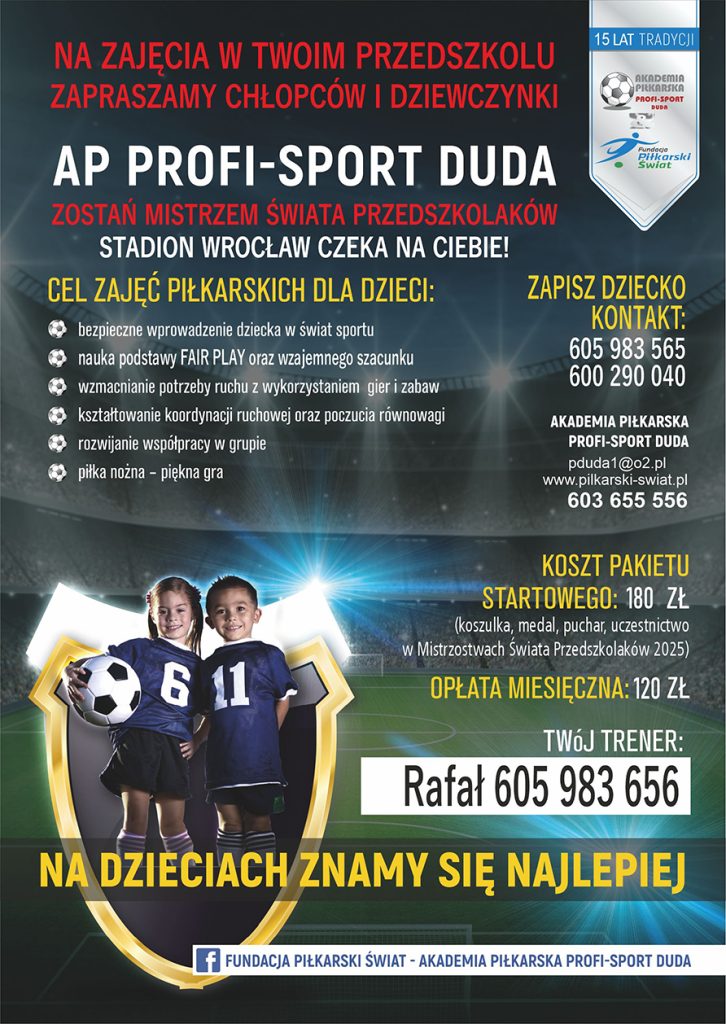 Szanowni Państwo, serdecznie zapraszamy Państwa pociechy na zajęcia z piłki nożnej organizowanych przez Akademię Piłkarską Profi Sport- Duda.